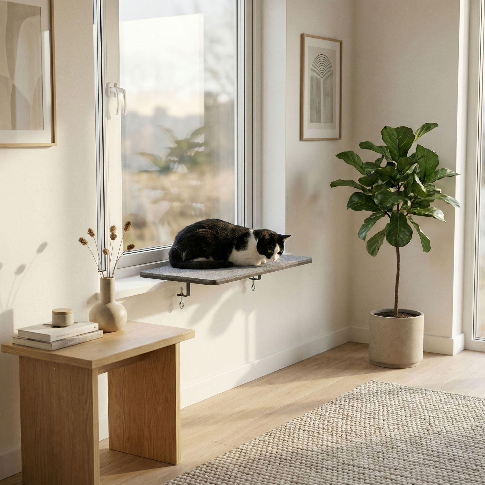 Tablette d'appui de fenêtre pour une vue imprenable. La chaise longue minimaliste pour rebord de fenêtre, étagère ou table crée de la place dans votre appartement, là où il n'y en avait pas auparavant. Avec son design épuré et élégant, elle s'intègre parfaitement dans tous les styles d'intérieur. Votre tigre d'appartement peut ainsi se détendre en observant les oiseaux par la fenêtre ou vous tenir compagnie à votre bureau lorsque vous travaillez de la maison.